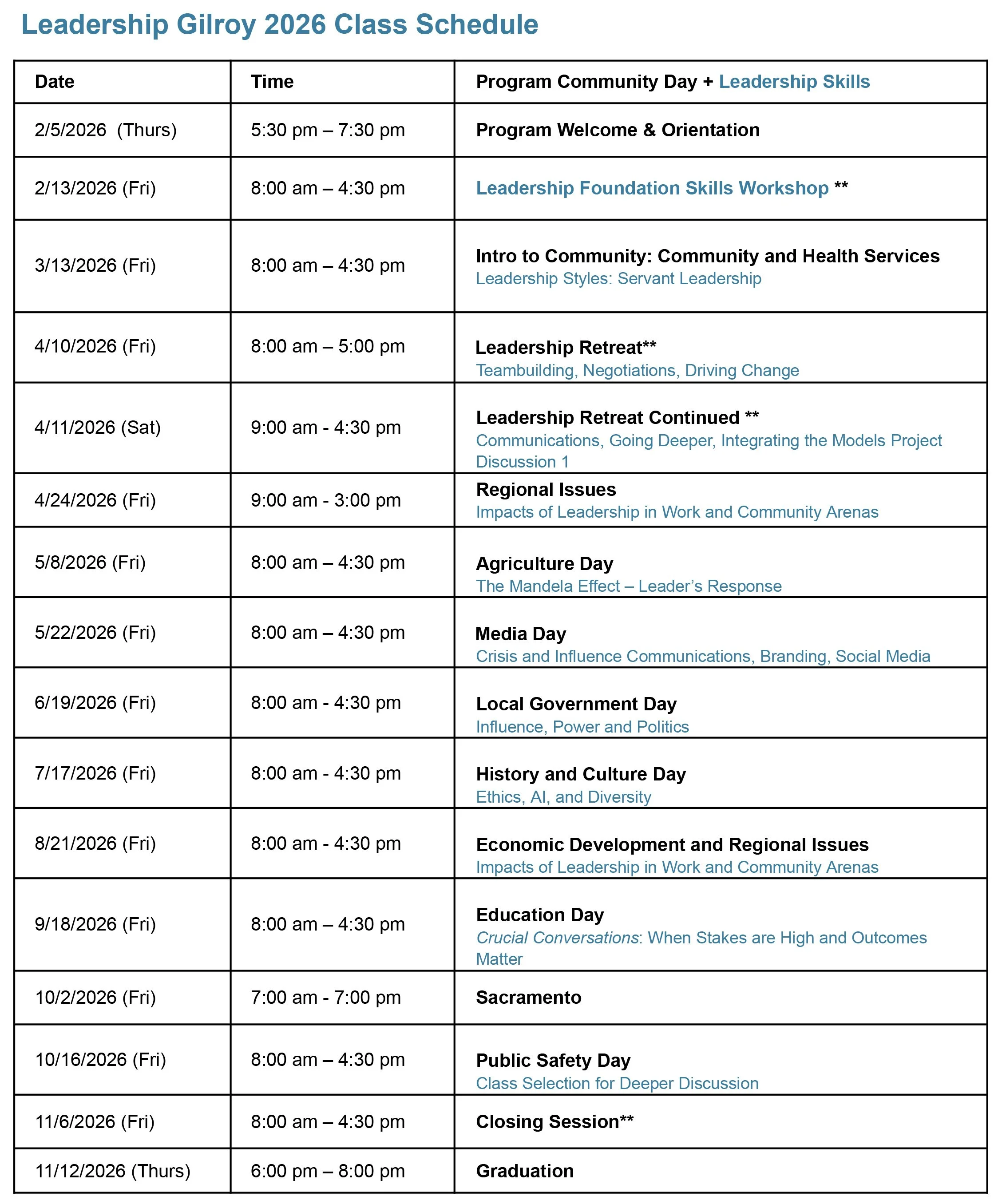 The Leadership Gilroy program content focuses on leading with impact and learning to collaborate with a diverse, accomplished and energized cohort of professional peers. Leadership skills are taught in the context of the community so that graduates emerge with skills immediately applicable to the workplace and a dramatically increased knowledge of the innerworkings of the community.